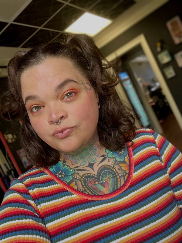 These days, I specialize in trippy, bold neotraditional color work and delicate blackwork. But more than anything, I create tattoos with intention, pieces that feel like a little bit of soul on your skin.